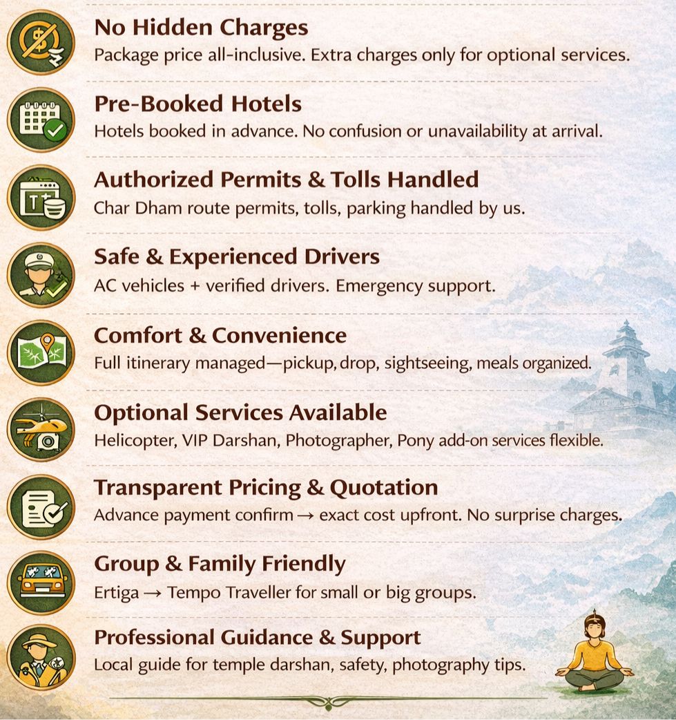 Choose us for a seamless and spiritually enriching Char Dham Yatra experience. We ensure safe travel, comfortable stays, and well-planned itineraries so you can focus only on your devotion. With our experienced team, trusted services, and 24/7 support, your journey becomes peaceful, secure, and truly unforgettable.